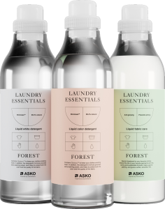 Средства для стиральных машин от Аско вышли в линейке Laundry Essentials и на 99,4% состоят из природных компонентов. Тара изготовлена из вторсырья и рассчитана на 1000 мл жидкости.