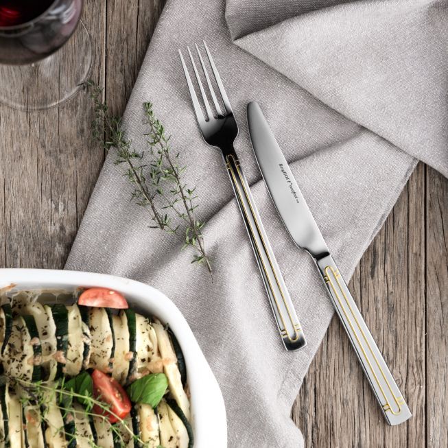 Этот стильный набор столовых приборов из линейки Heritage рассчитан на 6 персон и состоит из 30 предметов. Прямые линии, строгая форма — отличительная черта этих столовых принадлежностей. В качестве украшения — орнамент с позолотой, который придает набору изысканный, праздничный вид при сервировке стола.